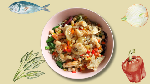 Salada Fresca de Bacalhau Assado Ingredientes 1 lata de bacalhau assado 1 chávena de grão-de-bico...